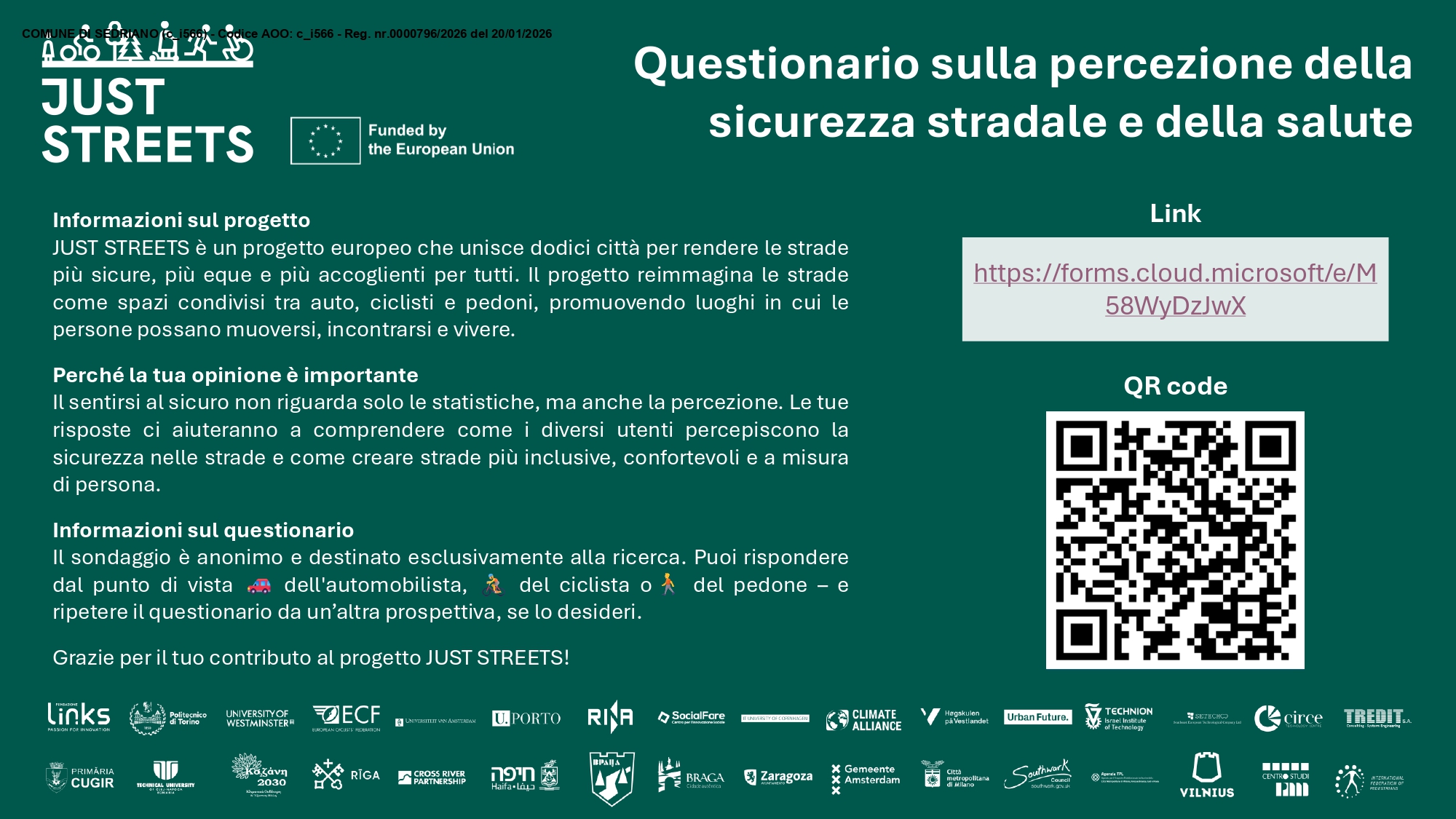 Per agevolare la divulgazione, alleghiamo un volantino contenente il QR code e il link diretto al questionario. E’ inoltre possibile fare riferimento anche alla pagina istituzionale della Città metropolitana di Milano dedicata al progetto (https://www.cittametropolitana.mi.it/trasporti/news/JUST-STREETS-Questionario-sulla-percezione-della-sicurezza-stradale-e-della-salute/).
