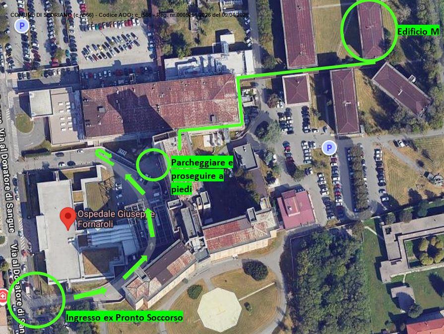 Accesso previo contatto telefonico al Numero Europeo Armonizzato (NEA) 116117, ingresso utenti da Via al Donatore di Sangue n.48 (citofonare in corrispondenza della sbarra per entrare – sia a piedi che in macchina – e proseguire seguendo i cartelli e le frecce verdi sull’asfalto).