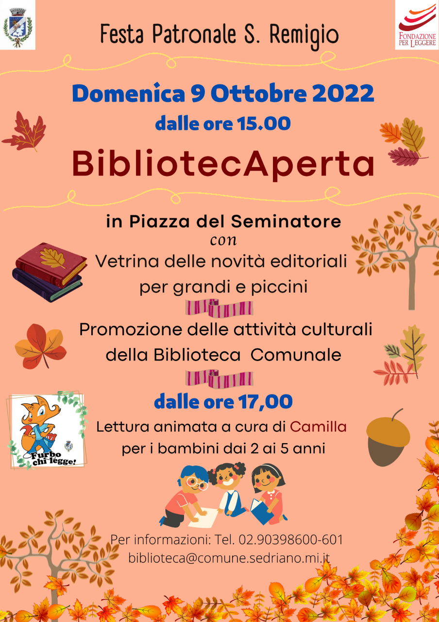 in piazza del seminatore con vetrina delle novità editoriali per grandi e piccini, promozione delle attività culturali della biblioteca comunale, lettura animata per i bambini dai 2 ai 5 anni