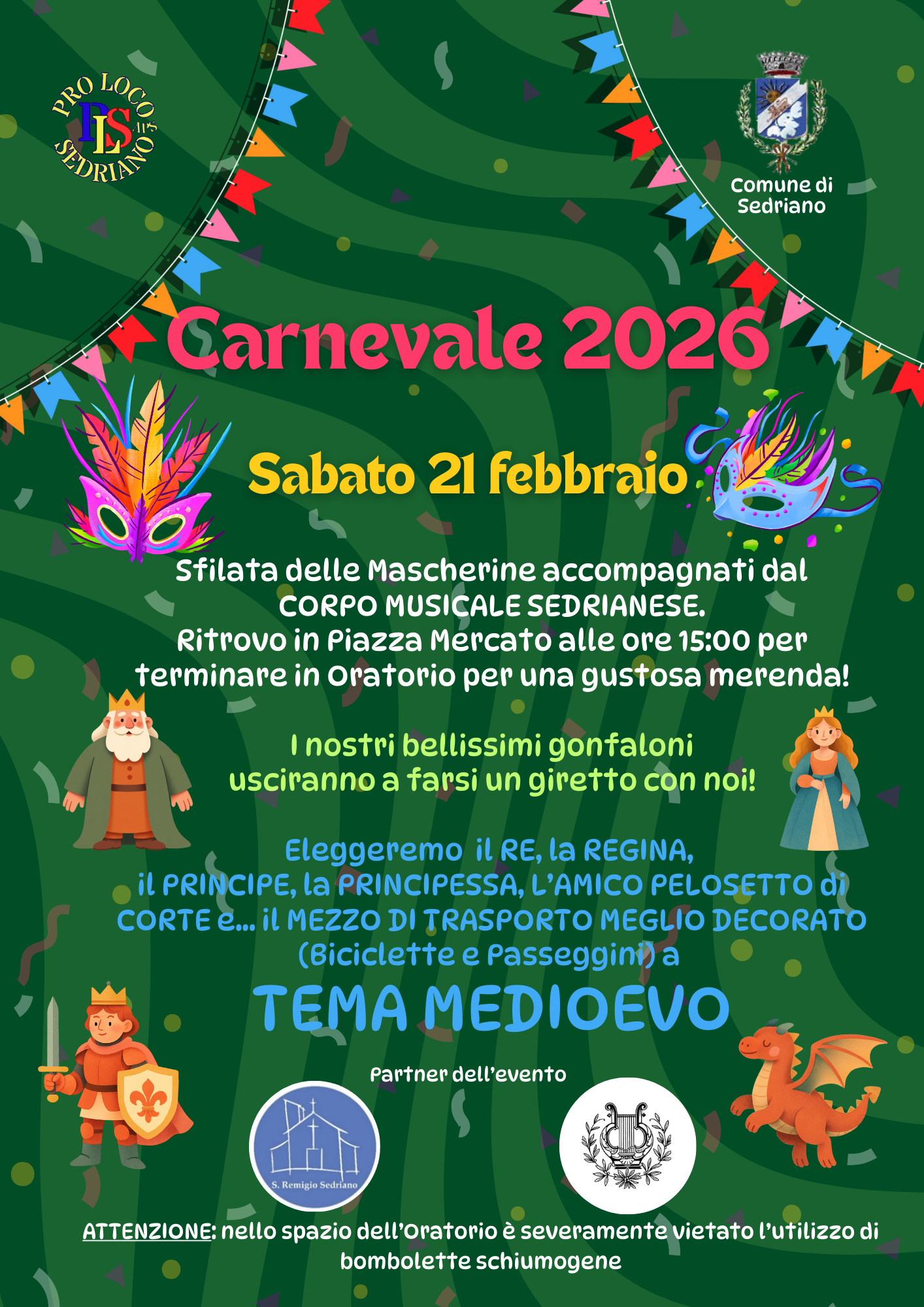 Sfilata delle Mascherine accompagnati dal CORPO MUSICALE SEDRIANESE. TEMA MEDIOEVO.