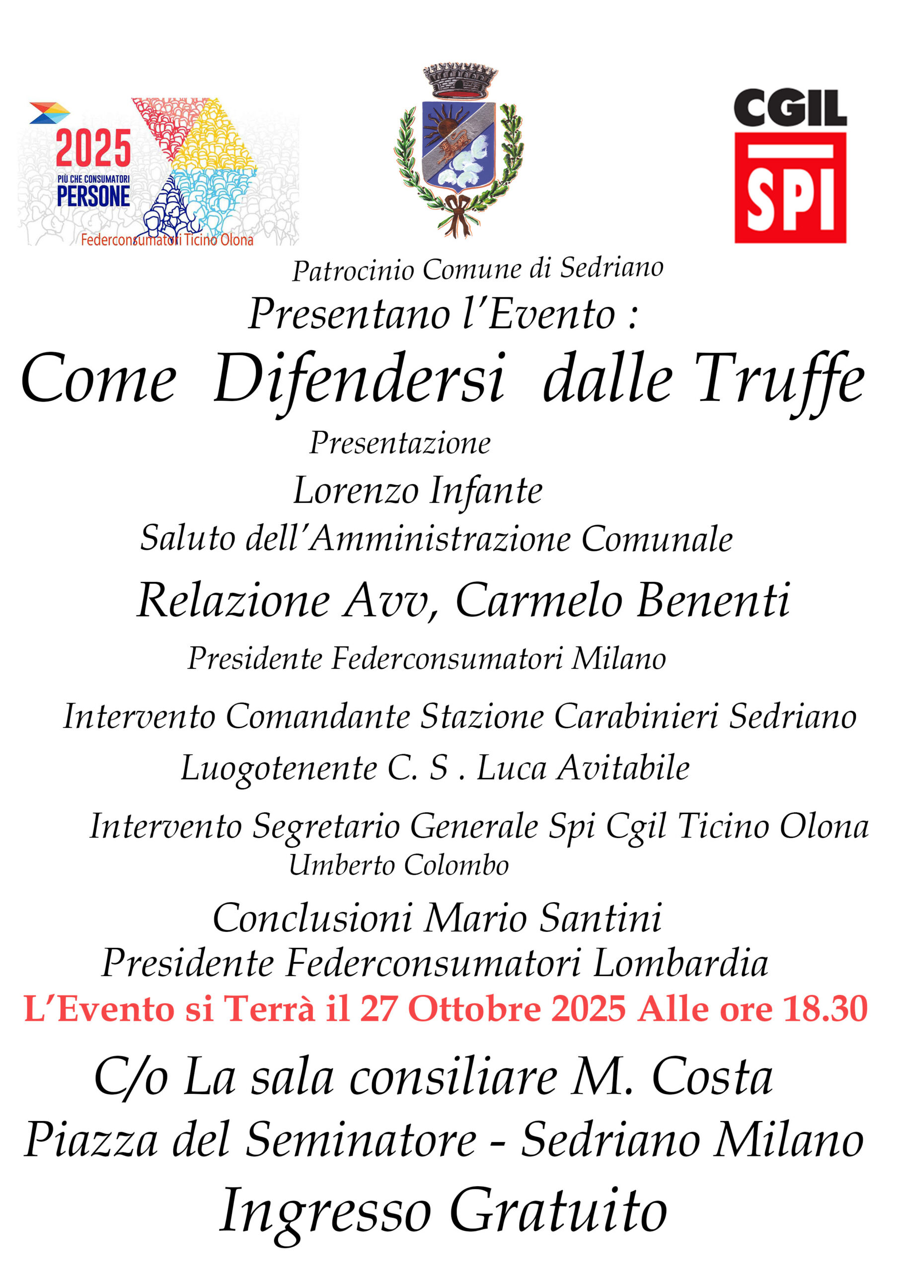 Notizie Comunicato importante ai cittadini: persone che si qualificano per conto del comune Avviso pubblico: scadenza concessioni cimiteriali nell'anno 2026 Avviso pubblico: scadenza fosse in campo comune Aggiornamento dell'Albo unico comunale degli Scrutatori di Seggio Vedi altri 6 Aggiornamento dell'Albo unico comunale dei Presidenti di Seggio Pratiche di Stato Civile a seguito di ingresso ANSC - rallentamenti Assegnazione Borse di studio a.s. 2024/2025 18 settembre 2025: Il Comune di SEDRIANO subentra in ANSC – Archivio Nazionale Informatizzato dei Registri dello Stato Civile Avviso pubblico assegnazione alloggi Autunno a Sedriano 2025