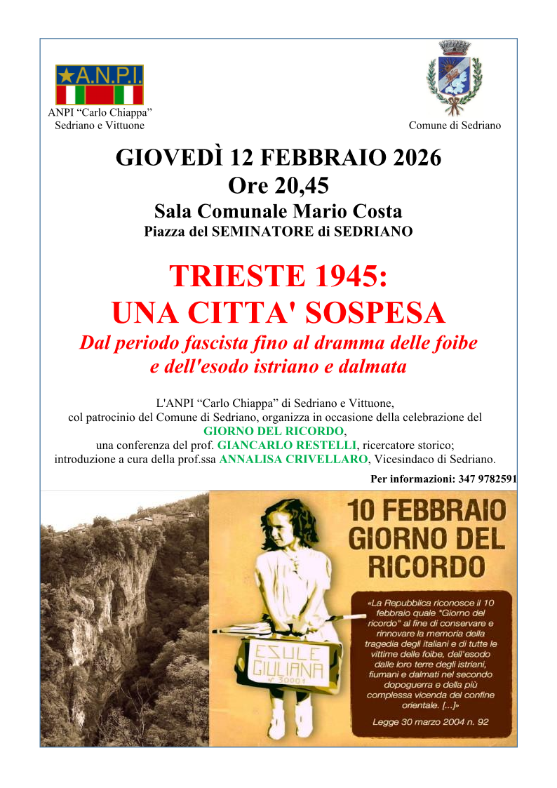 Conferenza a cura del Prof. Restelli Giancarlo “Trieste 1945: una città sospesa. Dal periodo fascista fino al dramma delle foibe e dell’esodo.” Introduzione a cura della Prof.ssa Annalisa Crivellaro – Vicesindaco del Comune di Sedriano. L’evento è promosso da ANPI sezione “Carlo Chiappa” Sedriano e Vittuone con il patrocinio del Comune di Sedriano.